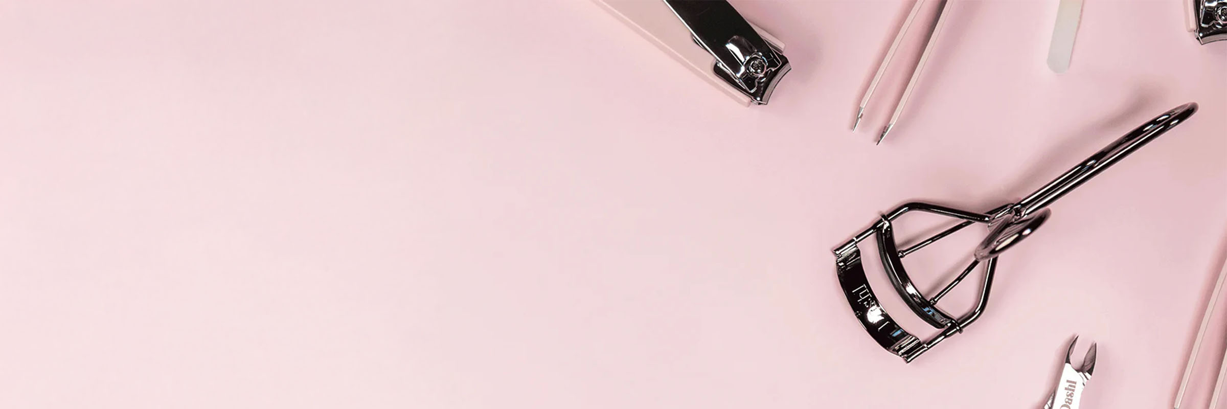Pink mascara with brush and eyelash curler on a light gray backgroundLash Lift Duo