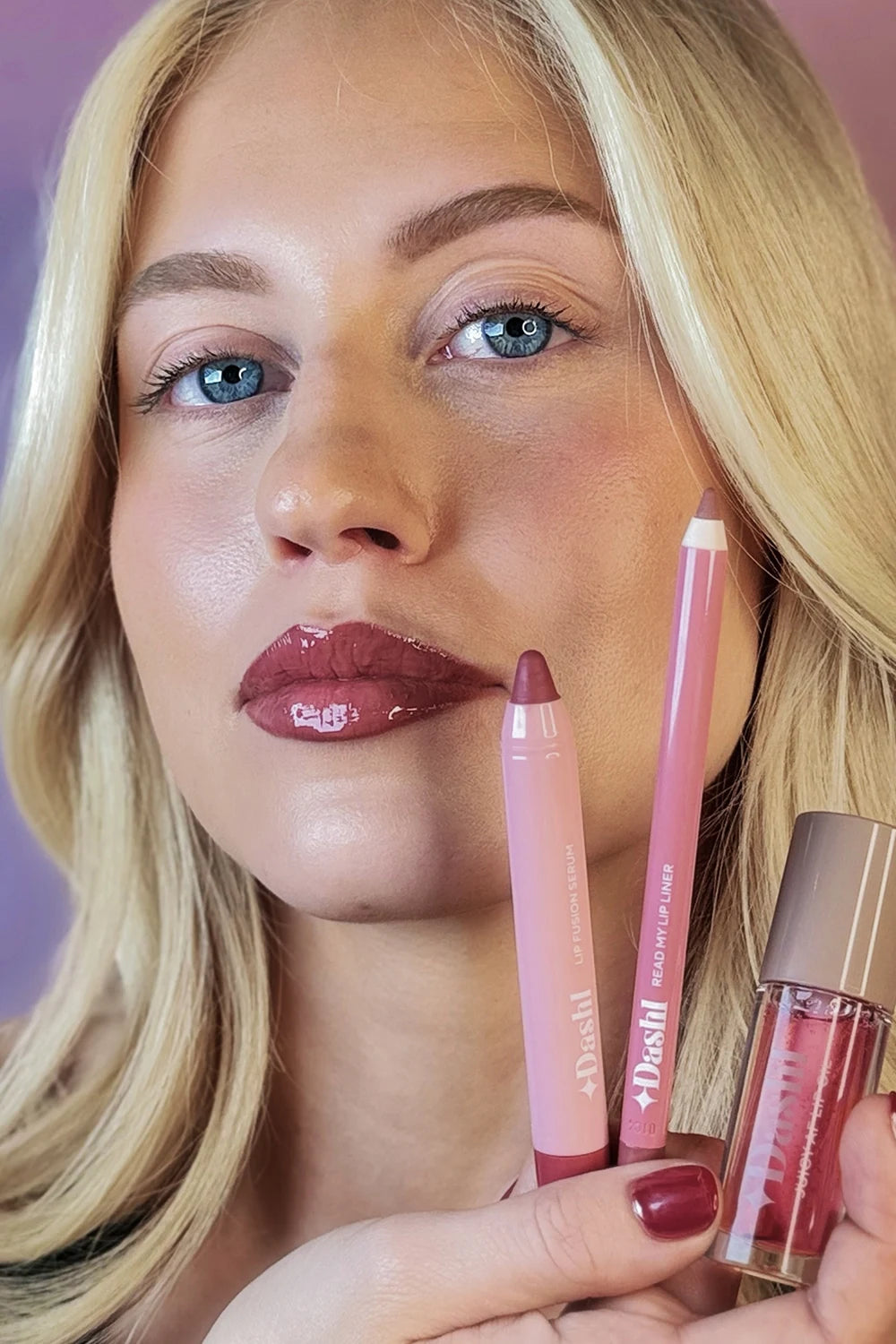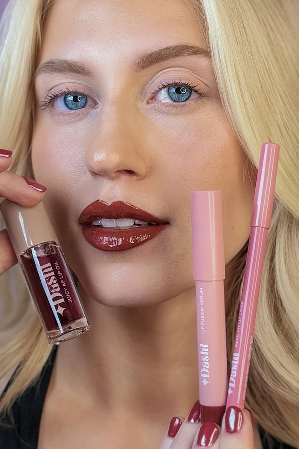 Lip Fusion Serum: Mulberry Crush, Read My Lip Liner: Copper Kiss, Juicy AF Lip Oil: Plum royal
